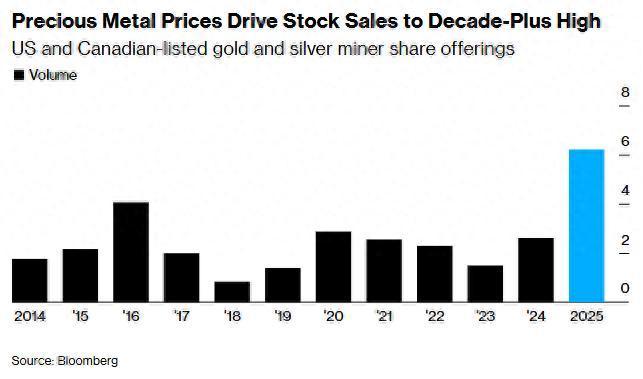 值得注意的是,去年大部分交易都出现了超额认购。Daniel Nowlan将这一现象归因于投资者对贵金属敞口的需求以及矿企为资金用途提供了令人信服的理由。另一个激励因素是——这些公司向投资者提供的股票折扣率超过3.5%。他表示:“定价是为了促成销售,但在大多数情况下,你是基于估值已经相当高的股票进行增发。”他还预计,金银矿企这种火热的股票增发势头将在2026年持续,至少年初会是如此。