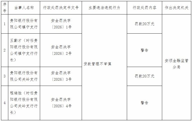 【大河财立方消息】1月8日,国家金融监督管理总局安顺监管分局披露的行政处罚信息显示,因贷款管理不审慎,贵阳银行镇宁支行、关岭支行均被罚20万元,合计罚款40万元,时任镇宁支行行长王勤才、时任关岭支行行长程端胜二人均被警告。