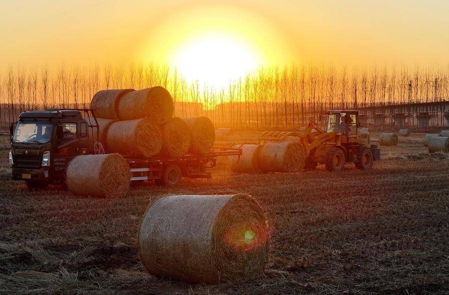 2025年12月27日,稻草回收企业的工人在河北省唐山市丰南区西葛镇的田间将打包好的水稻秸秆装车转运(无人机照片)。展望“十五五”