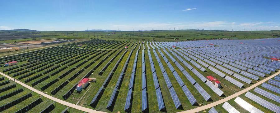 在河北省张家口市,光伏板整齐排列在国家级可再生能源示范区内(2023年8月18日摄,无人机照片)。
