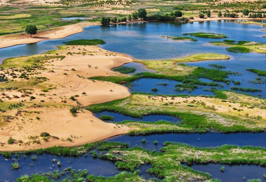 这是2025年6月6日拍摄的内蒙古鄂尔多斯市杭锦旗库布其沙漠中的一处绿洲(无人机照片)。