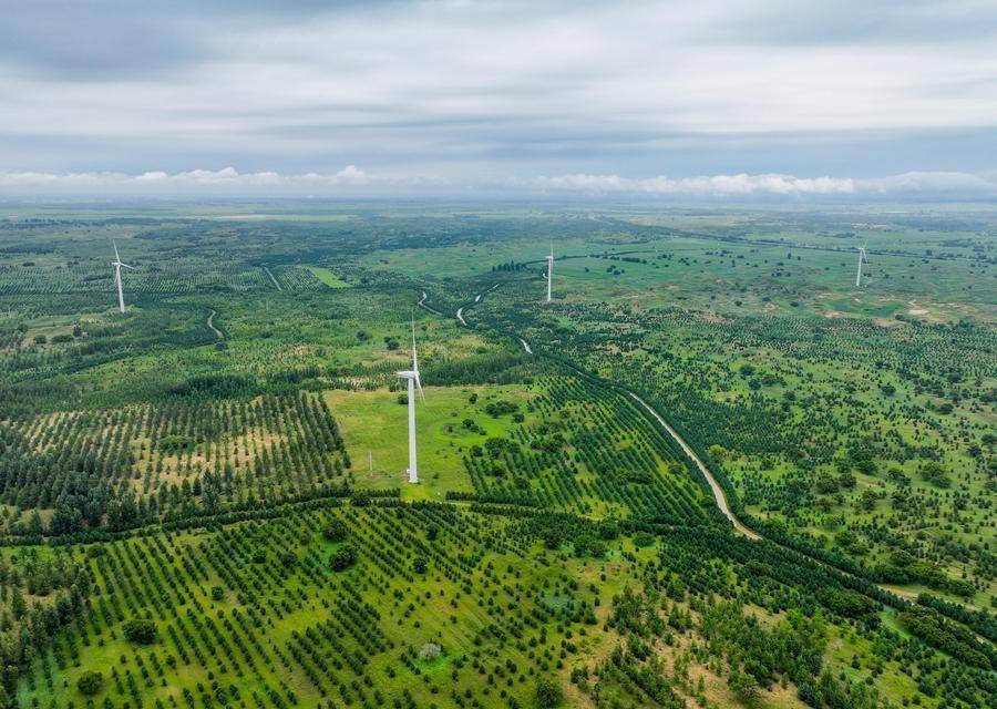 这是在内蒙古通辽市科尔沁左翼后旗,科尔沁沙地“双百万亩”综合治理工程努古斯台项目区内绿意盎然(2024年8月3日摄,无人机照片)。绿电、绿能、绿色经济蓬勃发展
