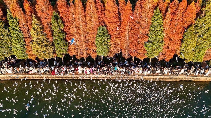2025年12月10日,游客在云南省昆明市滇池畔的海洪湿地公园喂红嘴鸥(无人机照片)。