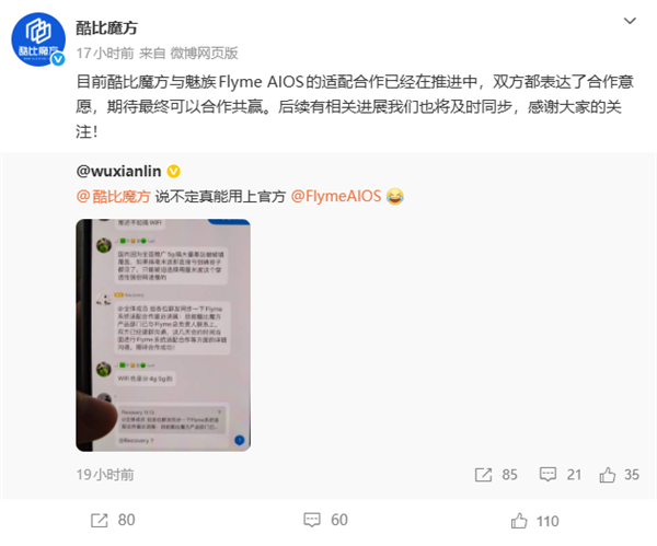 快科技3月1日消息,日前,酷比魔方官微发文称,与魅族Flyme AIOS的适配合作已经在推进中,双方都表达了合作意愿,期待最终可以合作共赢。